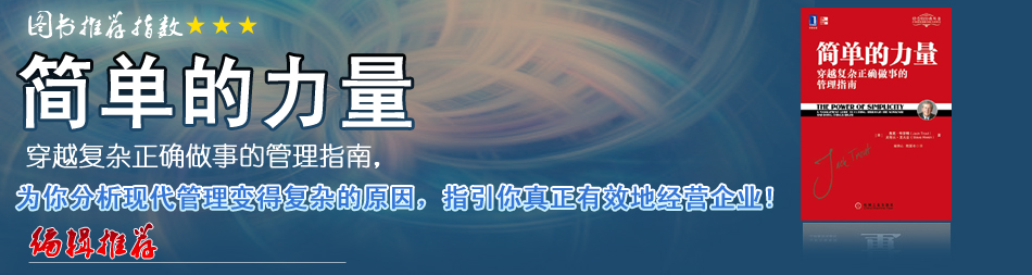 | 《簡(jiǎn)單的力量》回歸常識(shí),推崇簡(jiǎn)單,從管理、領(lǐng)導(dǎo)、人員、市場(chǎng)等幾大方面給出“極簡(jiǎn)主義”的建議。不過需要指出的是,這里的“簡(jiǎn)單”可不是簡(jiǎn)約、單調(diào),而是清楚明白、突出要點(diǎn)、直達(dá)心理。 |