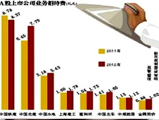 日前,證券財經網站全景網的統計顯示,據2012年年報數據,去年共有9家公司的業務招待費超過1億元,前十名合計達到29億元。其中絕大多數為央企,中國鐵建以8.37億元居于首位。另有241家上市公司的業務招待費超過1000萬元。