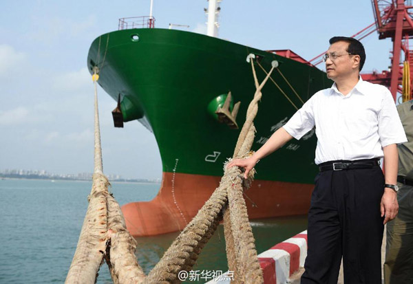 李克強(qiáng)總理到?诟鄞a頭了解貨物吞吐量及發(fā)展規(guī)劃等情況。他說,海南省四面環(huán)海,地處改革開放前沿。作為中國最大的經(jīng)濟(jì)特區(qū),海南的開放要從國家層面通盤考慮,力爭成為國家對外開放的重要支撐點(diǎn),要敢闖敢試,用開放帶動、促進(jìn)改革,倒逼改革。