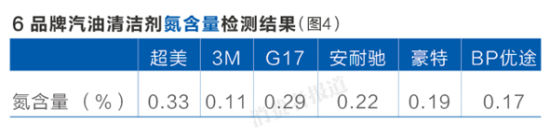 國家石油石化產(chǎn)品質(zhì)量監(jiān)督檢驗(yàn)中心工程師楊明桂對此分析,6品牌汽油清潔劑的氮含量檢測結(jié)果均不錯(cuò),即使是測試結(jié)果最高的0.33%