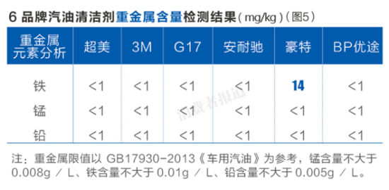 結(jié)果顯示,6個(gè)品牌鐵、錳、鉛等在此次檢測中均小于1mg/kg,即未檢出,只有豪特的鐵含量為14mg/kg。參與檢測的實(shí)驗(yàn)室工程師表示,6款產(chǎn)品的重金屬元素含量都不算高,而對比起每次加油時(shí)使用的汽油清潔劑用量,這些重金屬的實(shí)測含量可作忽略不計(jì)。