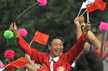 7月31日,在北京市延慶縣望京廣場,當地居民慶祝北京攜手張家口獲得2022年冬奧會舉辦權。 新華社記者 高健鈞/攝 |