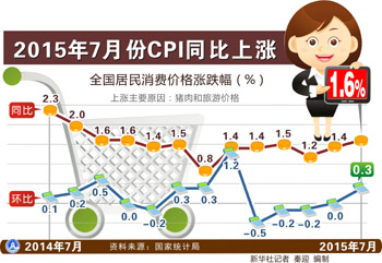 ??? 受國內“豬周期”及國際大宗商品價格暴跌影響,我國居民消費價格指數(CPI)和工業生產者出廠價格指數(PPI)走勢進一步分化。國家統計局9日公布數據顯示,7月我國CPI同比上漲1.6%,漲幅連續第二個月擴大,較6月增加0.2個百分點,創下9個月來新高;PPI同比下降5.4%,跌幅連續第二個月擴大,較6月降低0.6個百分點,連續第41個月負增長。