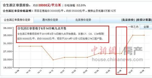 通州合生濱江帝景房價走勢圖:8月14日售價調整為均價35000元每平米,6月份的均價為26000元每平米。
