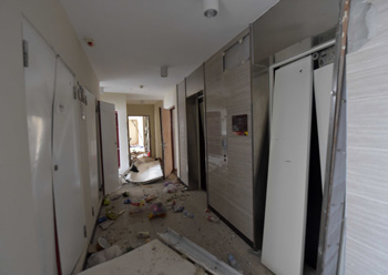 8月13日拍攝的爆炸地點附近的萬科清水藍灣小區受損情況,電梯和門已經被毀壞。 新華社記者 岳月偉/攝 |