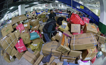 11月12日,在中國郵政寧夏分公司分揀中心,工作人員在將快件包裹分類。 新華社記者 彭昭之/攝 |