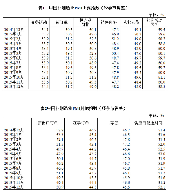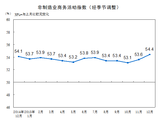 2015年12月份,中國非制造業商務活動指數為54.4%,比上月上升0.8個百分點,升至2015年內高點,擴張動力較為強勁。