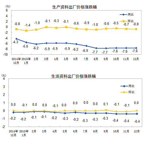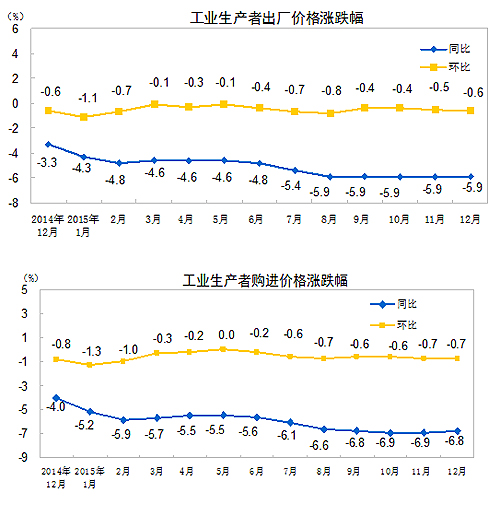 2015年12月份,全國工業生產者出廠價格環比下降0.6%,同比下降5.9%。工業生產者購進價格環比下降0.7%,同比下降6.8%。2015年,工業生產者出廠價格同比下降5.2%,工業生產者購進價格同比下降6.1%。