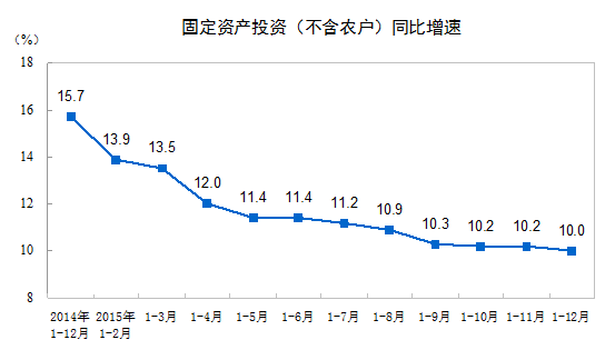 2015年,全國固定資產(chǎn)投資(不含農(nóng)戶)551590億元,比上年名義增長10%(扣除價(jià)格因素,實(shí)際增長12%),增速比1-11月份回落0.2個(gè)百分點(diǎn)。從環(huán)比速度看,12月份固定資產(chǎn)投資(不含農(nóng)戶)增長0.68%。