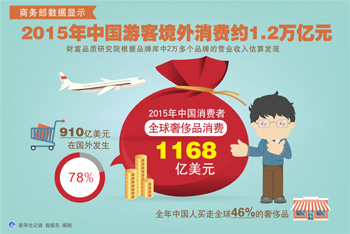 火爆的出境游帶動了海外消費。國家旅游局數據顯示,2015年,中國出境旅游達1.2億人次,出境人次和消費均列世界第一。商務部數據顯示,2015年中國游客在境外消費約1.2萬億元,繼續保持世界主要旅游消費群體稱號。