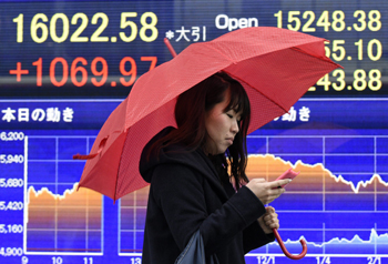 2月15日,一名女子在日本東京經過一塊股指顯示屏。受上周末歐美股市大漲、國際油價上升、日元貶值及投資者逢低買入操作等多重利好因素刺激,東京股市日經225種股票平均價格指數15日飆升千余點至16000點關口以上,漲幅達7.16%。 新華社/歐新中文? |
