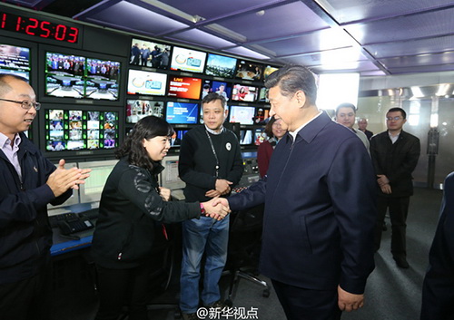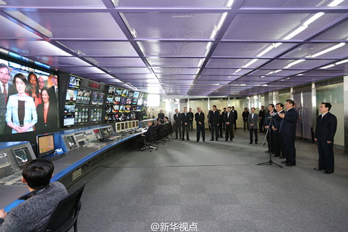 【總書記連線央視北美分臺】19日上午,習近平在中央電視臺調研,來到總控中心同位于華盛頓市中心的北美分臺視頻連線,了解分臺建設運行情況。當得知分臺成立4年,每天提供5小時、全自制的節目,90%的工作人員來自當地,習近平對此表示肯定,向分臺全體人員致以親切問候和良好祝愿。