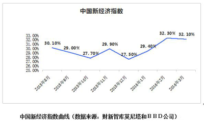 發(fā)展新經(jīng)濟(jì)、培育新動(dòng)能,是當(dāng)前推進(jìn)供給側(cè)結(jié)構(gòu)性改革的重要內(nèi)容。財(cái)新智庫(kù)與BBD(成都數(shù)聯(lián)銘品科技有限公司)聯(lián)合發(fā)布的中國(guó)新經(jīng)濟(jì)指數(shù)顯示,今年開(kāi)春以來(lái),新經(jīng)濟(jì)脈絡(luò)若隱若現(xiàn)、緩慢爬升:今年1至4月,新經(jīng)濟(jì)占整個(gè)經(jīng)濟(jì)的比重分別為29.4%、32.3%、32.1%、30.0%,高于2015年8月以來(lái)的平均水平。