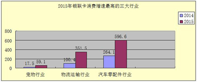 物流運(yùn)輸行業(yè)(包括快遞、貨物搬運(yùn)和托運(yùn))銀聯(lián)網(wǎng)絡(luò)消費(fèi)金額由2014年的100.4億元增長(zhǎng)至351.5億元,同比上漲250.1%,增速較上年同期提高218.5個(gè)百分點(diǎn)。物流行業(yè)呈爆發(fā)式發(fā)展。