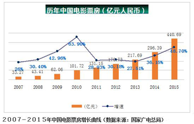 中國(guó)成全球增速最快、潛力最大影視市場(chǎng)。據(jù)廣電總局公布的數(shù)據(jù),2015年我國(guó)電影總票房為440.69億元,同比增長(zhǎng)48.7%;全年觀影人次12.6億,同比增長(zhǎng)51.08%。Imax首席執(zhí)行官Rich Gelfond預(yù)測(cè),中國(guó)將在2017年超越美國(guó)成為全球最大的電影市場(chǎng)。
