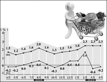 食品價(jià)格的波動在今年春季CPI的上漲中扮演了關(guān)鍵的角色。今年2月至4月,豬肉價(jià)格同比分別上漲25.4%、28.4%和33.5%,鮮菜價(jià)格同比分別上漲30.6%、35.8%和22.6%。但是從環(huán)比來看,自3月份起,鮮菜價(jià)格開始下滑,4月份這種趨勢進(jìn)一步加劇。國家統(tǒng)計(jì)局城市司高級統(tǒng)計(jì)師余秋梅表示,4月份CPI環(huán)比下降0.2%,主要就是受到了鮮菜價(jià)格下降較多的影響。4月份正值春夏之交,應(yīng)季鮮菜大量上市,鮮菜價(jià)格環(huán)比下降12.5%,影響CPI環(huán)比下降約0.43個(gè)百分點(diǎn)。