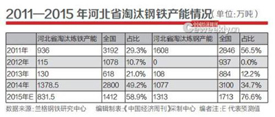 2016年2月4日,國務院發(fā)布《關于鋼鐵行業(yè)化解過剩產(chǎn)能實現(xiàn)脫困發(fā)展的意見》。意見明確,從2016年開始,在近年來淘汰落后鋼鐵產(chǎn)能的基礎上,用5年時間再壓減粗鋼產(chǎn)能1億~1.5億噸。蘭格鋼鐵研究中心研究員徐莉穎向《中國經(jīng)濟周刊》記者介紹,截至2015年底,河北省鋼鐵產(chǎn)能約在3億~3.2億噸。參考河北省“十三五”產(chǎn)能控制目標為2億噸,也就是在不新增任何產(chǎn)能的前提下,河北省從今年開始到2020年之前將要淘汰1.2億噸的鋼鐵產(chǎn)能。如果完成,那么全國壓縮1億~1.5億噸產(chǎn)能的任務目標完成毫無壓力。