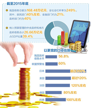 據統計,截至2015年末,我國納入預算管理的中央政府債務10.66萬億元,地方政府債務16萬億元,合計政府債務26.66萬億元,占GDP比重為39.4%。如果把地方融資平臺加進來,以更寬的口徑估算,政府債務水平達到56.8%,仍低于歐盟60%的警戒線,也低于當前主要市場經濟國家和新興市場國家水平,比如,日本超過200%、美國超過120%、法國120%左右、德國80%左右、巴西100%左右。