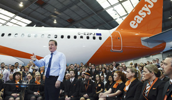 5月24日,英國首相卡梅倫在倫敦北部盧頓的易捷航空公司總部發表講話。 卡梅倫當日說,如果在下月舉行的公投中選擇脫離歐盟,英國家庭去歐洲其他國家的旅行花費平均水平將會上升。這是卡梅倫近期一系列警告脫歐將沖擊英國家庭經濟狀況的最新表態。 新華社/路透? |