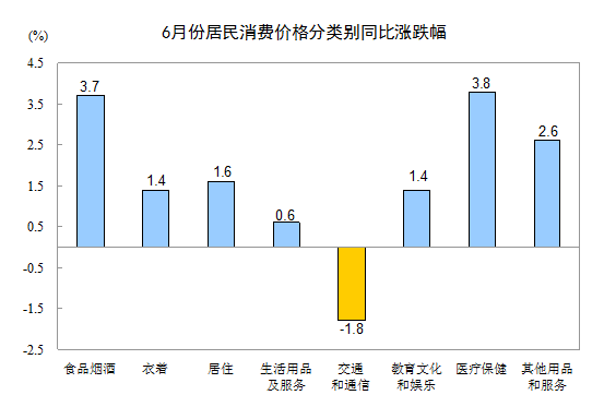 6月份,其他七大類價(jià)格同比六漲一降。其中,醫(yī)療保健、其他用品和服務(wù)、居住、衣著、教育文化和娛樂、生活用品及服務(wù)價(jià)格分別上漲3.8%、2.6%、1.6%、1.4%、1.4%、0.6%;交通和通信價(jià)格下降1.8%。
