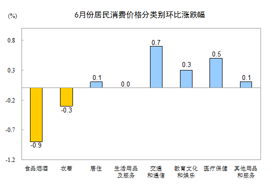6月份,全國(guó)居民消費(fèi)價(jià)格總水平環(huán)比下降0.1%。其中,城市下降0.1%,農(nóng)村下降0.1%;食品價(jià)格下降1.4%,非食品價(jià)格上漲0.2%;消費(fèi)品價(jià)格下降0.4%,服務(wù)價(jià)格上漲0.3%。