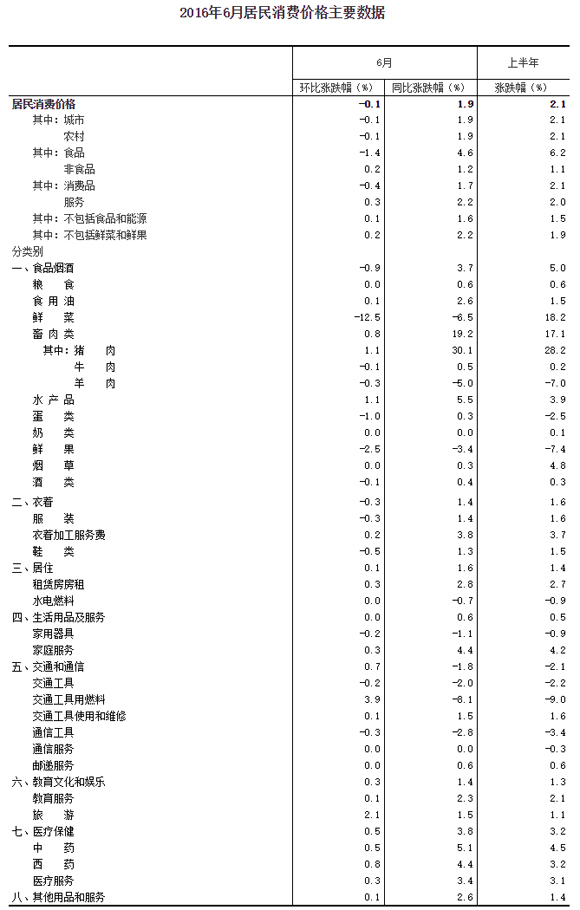 2016年6月份,全國(guó)居民消費(fèi)價(jià)格總水平同比上漲1.9%。其中,城市上漲1.9%,農(nóng)村上漲1.9%;食品價(jià)格上漲4.6%,非食品價(jià)格上漲1.2%;消費(fèi)品價(jià)格上漲1.7%,服務(wù)價(jià)格上漲2.2%。上半年,全國(guó)居民消費(fèi)價(jià)格總水平比去年同期上漲2.1%。