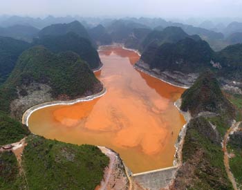?這是記者近日航拍的廣西華銀鋁業有限公司龍山排泥庫。該庫庫容2293萬立方米,相當于40多個北京北海的容量。尾礦庫長期堆存于青山間,不僅污染著生態,更在2008年至2012年的4年間,先后發生9次泄漏,靖西境內眾多村民房屋被淹,大量農田被毀。記者 周華/攝 |