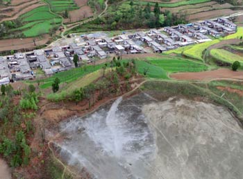 這是記者近日拍攝的甘肅省隴南市徽縣江洛鎮劉壩村一尾礦庫。這個尾礦庫下方除了有70、80戶居民外,還有1所學校。根據統計,隴南全市“頭頂庫”下面集中著22個村和居民區,31座選礦廠,2所學校和2座炸藥庫。近年來,當地尾礦庫陸續發生險情,警訊不斷,隱患重重。記者 周華/攝? |