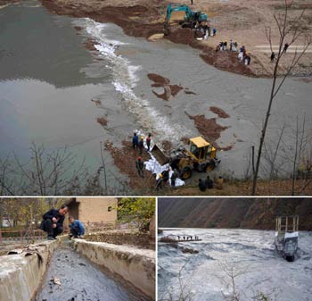 ?這是記者拍攝的甘肅省隴南市西和縣隴星銻業公司尾礦庫泄漏事故救援現場。流經西和縣的太石河因尾礦泄漏成了環保事件中有名的“水泥河”。 2015年11月,隴星銻業公司尾礦庫二號溢流井隔板破損出現漏沙約3000立方米,經太石河流入西漢水,造成涉及甘肅、陜西、四川三省的重大突發環境事件。記者 黃文新/攝 ? |