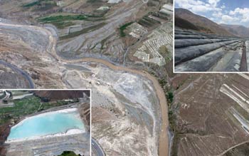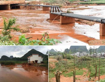 云南省昆明市東川區的小江和直接建在河谷里的兩座尾礦庫近景。金沙江一級支流——小江,2008年以前的尾砂直排和特殊地質地貌,使小江成為一條泥沙河,每年有超過3000萬噸泥沙經小江注入金沙江。記者 周華/攝 |