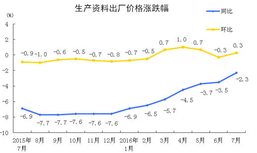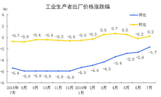 2016年7月份,全國工業生產者出廠價格環比上漲0.2%,同比下降1.7%。工業生產者購進價格環比上漲0.3%,同比下降2.6%。1-7月平均,工業生產者出廠價格同比下降3.6%,工業生產者購進價格同比下降4.5%。