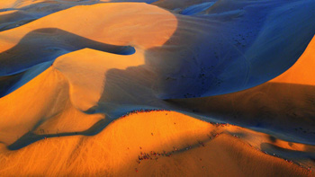 游人爬鳴沙山時(shí),由于阻力較大又有綿綿細(xì)沙,只能進(jìn)一步、退半步,似乎行而無(wú)力、速度很慢,所以手腳并用往上爬是個(gè)好方法。登上鳴沙山頂,一道道的沙峰如金色波浪,氣勢(shì)磅礴、洶涌澎湃。山坡上的沙浪,由于游人的行踏,似碧波蕩漾泛起漣漪,層層沙流下滑的跌宕有致、妙趣橫生。