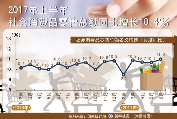 ????上半年,我國市場銷售增長加快,社會消費品零售總額172369億元,同比增長10.4%,增速比一季度加快0.4個百分點。其中,網上銷售增長強勁,同比增長33.4%,比一季度加快1.3個百分點。