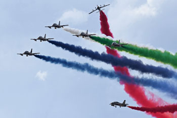 ??? 7月23日,在俄羅斯莫斯科郊外的茹科夫斯基市,阿聯(lián)酋空軍“騎士”飛行表演隊在莫斯科航展上進行飛行表演。 當(dāng)日,莫斯科國際航空航天展覽會閉幕。新華社/衛(wèi)星社 |