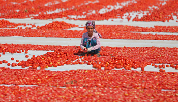 ??? 8月2日,在土耳其伊茲密爾,工人把番茄切開放在太陽底下曬成番茄干。新華社/歐新 |