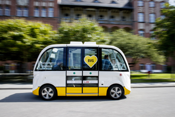 ??? 7月31日,在德國柏林,法國公司Navya制造的無人駕駛電動汽車行駛在柏林醫科大學內。柏林公交公司計劃2018年在柏林醫科大學內開通兩條無人駕駛電動汽車專線。新華社/歐新 |