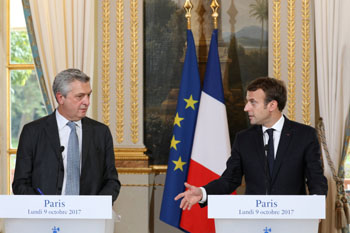 ??? 10月9日,在法國巴黎愛麗舍宮,法國總統馬克龍(右)與聯合國難民事務高級專員菲利波·格蘭迪出席聯合新聞發布會。馬克龍9日在會見格蘭迪后發表公開聲明說,法國將在難民事務方面進行多項改革,提高效率,幫助難民融入法國社會,同時更嚴格地遣返不符合避難條件的人。新華社/路透 |