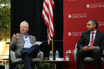 ??? 10月9日,在美國芝加哥大學布斯商學院,理查德·塞勒教授(左)出席記者會。瑞典皇家科學院9日宣布,將2017年諾貝爾學獎授予美國經濟學家理查德·塞勒,以表彰他在行為經濟學研究領域作出的突出貢獻。記者 王強 攝 |