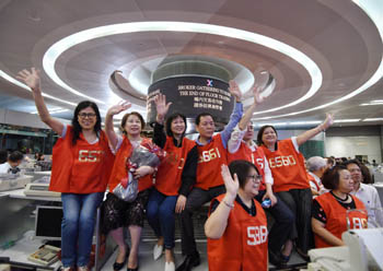 ??? 隨著香港交易所10月27日收市鈴聲響起,最后兩位穿紅馬甲的交易員結束交易,準備收拾辦公用品離開。自此,香港證券業在交易大堂內進行交易的時代畫上圓滿句號。圖為身穿紅馬甲的交易員在揮手告別。新華社發(王申 攝) |
