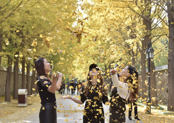 ??? 10月31日,游客在圓明園銀杏大道游玩。北京圓明園內有一條近千米的銀杏大道,目前已進入最佳觀賞期,黃燦燦的銀杏葉和兩側圍墻上紅色的藤蔓相互映襯,美不勝收,吸引游客前來觀賞。記者 羅曉光 攝 |