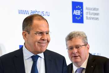 ??? 10月31日,在俄羅斯莫斯科,俄羅斯外交部長拉夫羅夫(左)出席駐俄歐洲企業協會成員代表參加的會議。拉夫羅夫當日于此表示,俄方希望與歐盟開展更多經貿往來,共同推進歐亞一體化進程。新華社/法新 |