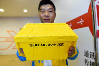 ??? 10月31日,江蘇南京蘇寧云倉物流基地工作人員展示“共享快遞盒”。據首家使用和推廣“共享快遞盒”的蘇寧易購介紹,電商物流將智能包裝和末端服務相結合,采用可循環的特制快遞包裝盒代替傳統常用紙箱,每個特制快遞盒成本25元,可循環使用1000余次。記者 李博 攝 |
