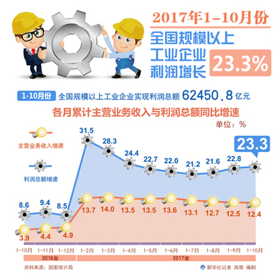 數據顯示,2017年1-10月份,規模以上工業企業利潤同比增長23.3%,增速比1-9月份加快0.5個百分點。其中,10月份利潤同比增長25.1%,增速雖比9月份減緩2.6個百分點,但仍是今年以來月度較高增速。