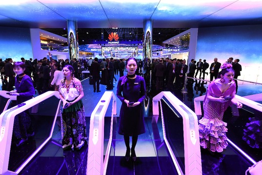 為期四天的2018年世界移動通信大會2月26日在巴塞羅那開幕。圖為當(dāng)日,人們在西班牙巴塞羅那舉行的世界移動通信大會上參觀華為公司展臺。新華社記者 郭求達(dá) 攝