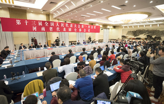 3月6日,十三屆全國人大一次會議河南代表團全體會議向媒體開放。新華社記者 丁海濤 攝
