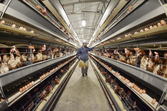 經過數道“關卡”消毒,記者才進入蛋雞養殖區域,看到所有雞舍均經過密閉化處理,與外界人員嚴格隔離,雞舍內采用德國進口智能化飼養設備,并有自動調控溫度、濕度、空氣的內控系統。3條自動傳送帶將雞蛋、雞糞、飼料分離傳送,自動化蛋品揀選設備對每一枚雞蛋進行檢測、殺菌、噴碼和分級處理,雞糞則通過地下輸糞帶送入發酵處理系統。