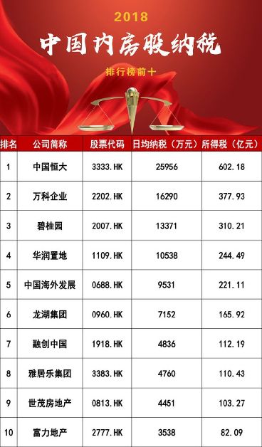 恒大以602.18億元所得稅登2018年中國內房股納稅榜單排名第一