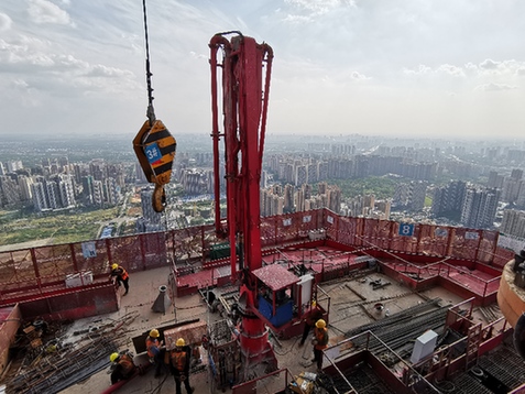“效率比傳統塔吊大約提升30%。”中國建筑第三工程局有限公司(下稱“中建三局”)綠地中心468項目總工程師楊書海說:“這一系統由中建三局獨立設計研發,具有自主知識產權。其中有施工集成平臺,有無人操作的智能電梯,還有中建三局首創的廻轉塔機,最多可以安裝4臺塔吊,根據吊裝需求選擇各式塔機合理配置,實現多塔機整體、連續、快速、安全頂升,平均每6天建一層樓,獲得多項國家專利。”