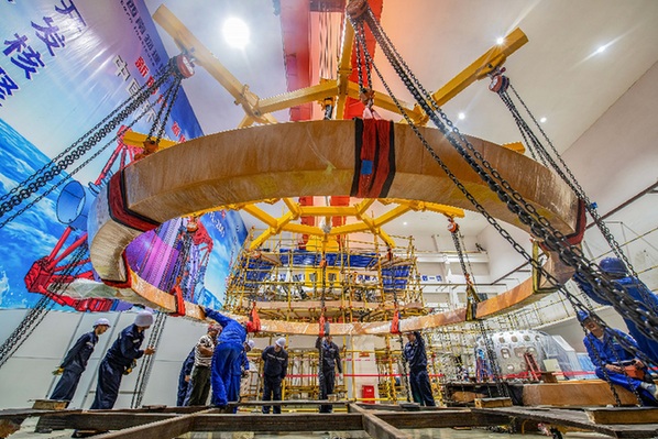 中核集團核工業西南物理研究院的工作人員在安裝調試中國環流器二號M裝置時起吊線圈。新華社發