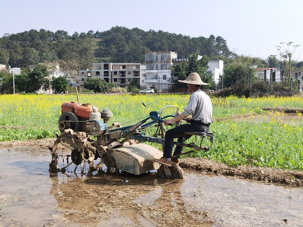 桂平市是廣西重要的糧食種植基地之一,去年糧食種植面積達157.21萬畝,糧食總產量55.37萬噸。一大早,桂平市石咀鎮治安村48歲的村民冼才貞趕到農田,駕駛耕地機忙著犁地,一上午要把3畝剛灌溉的農田翻犁一遍,為接下來的水稻育秧做好準備。“我泡種300多斤,現在已經開始育秧了。”冼才貞說,目前他種有150多畝水稻,今年準備擴種20畝稻田。